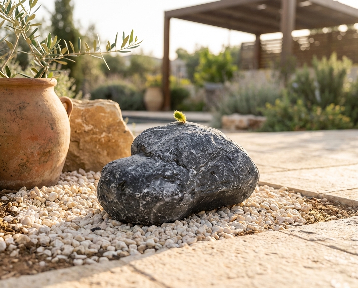 אבן נוי דקורטיבית בגוון שחור עם פסים לבנים, מוסיפה מראה טבעי ואותנטי לכל גינה או בריכת נוי. מתאימה במיוחד לעיצוב פינות חמד חיצוניות, מסלעות וגינות יפניות.