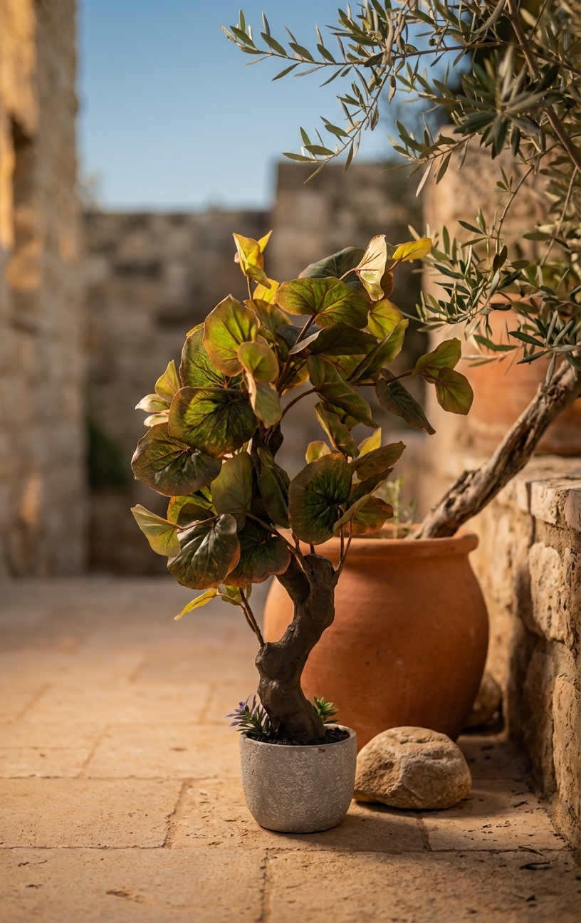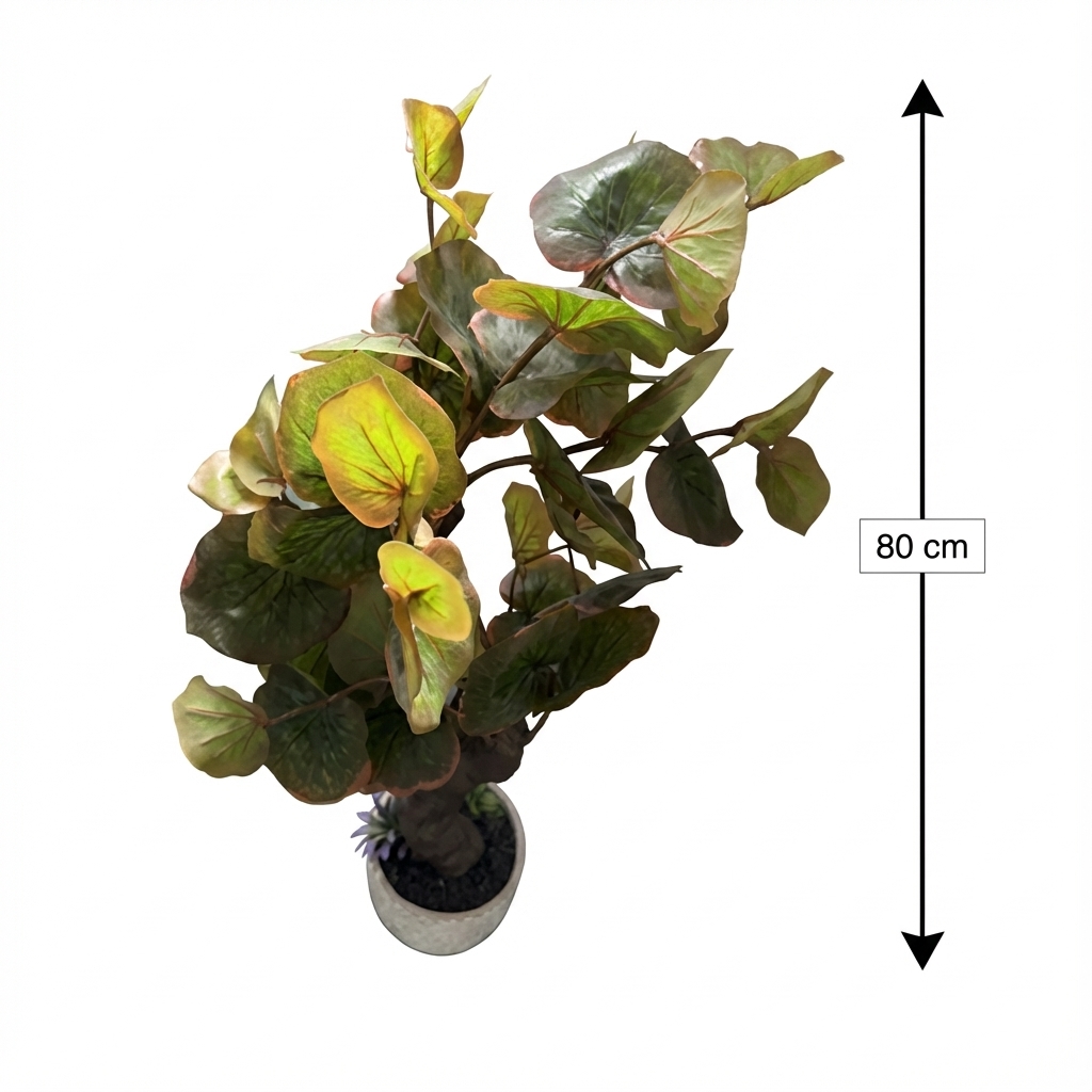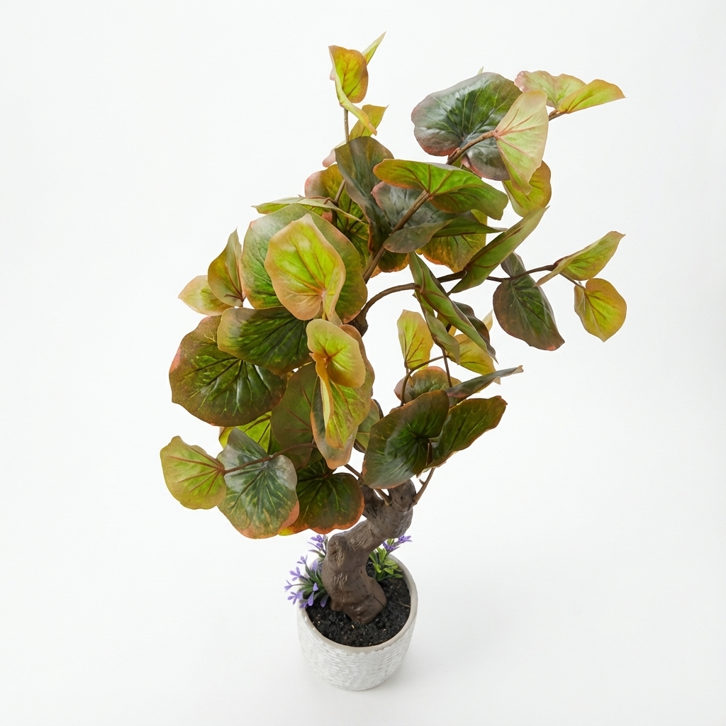 בגוניה מלאכותית בעציץ, המדמה צמח אמיתי עם עלים בצבעים ירוק ואדום. מתאימה לעיצוב הבית או המשרד ומוסיפה מראה רענן וטבעי לחלל.