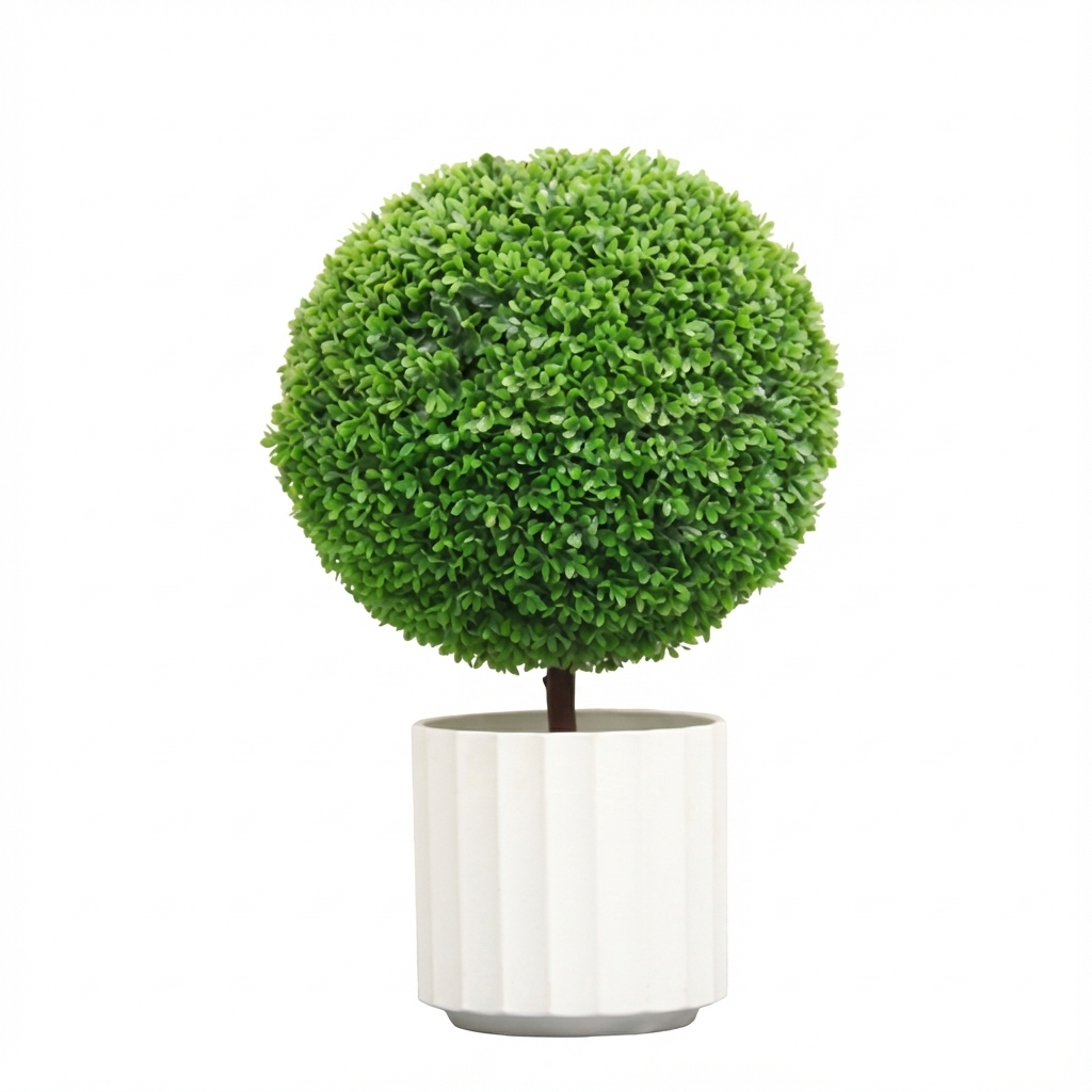 טופיארי כדור מלאכותי מושלם לעיצוב הבית ולמשרד, מגיע עם עציץ לבן מודרני.