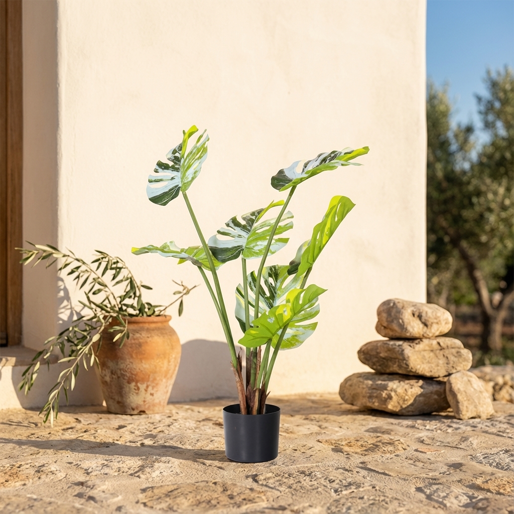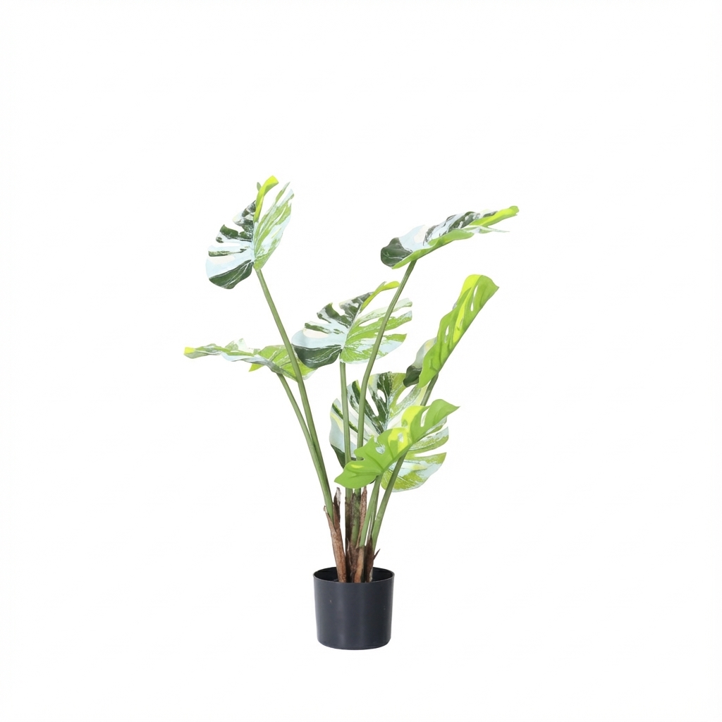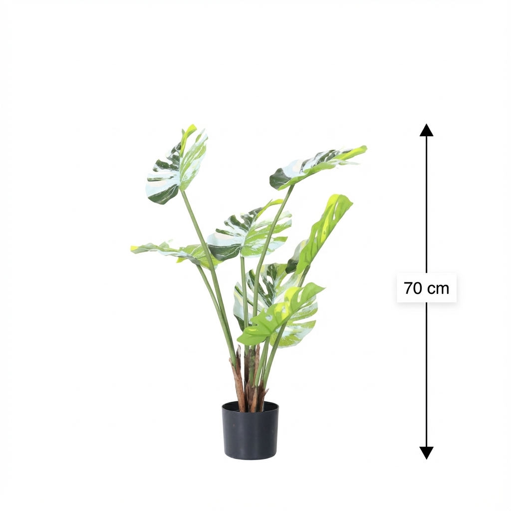מונסטרה מלאכותית בעציץ שחור, פתרון מושלם להוספת ירק וצבע לחלל הבית או המשרד. הצמח מתאים למי שמחפש אלמנט עיצובי קל לתחזוקה.