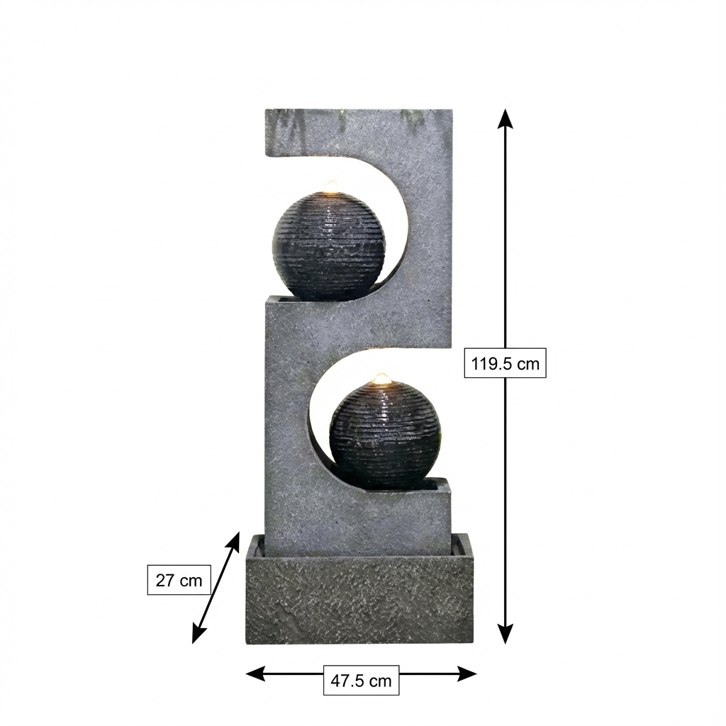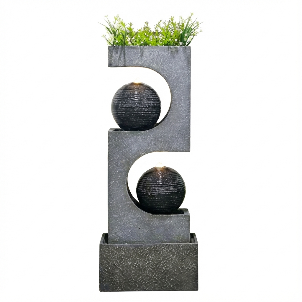 מזרקת נוי כדורית מודרנית, מוסיפה אווירה נעימה ומרגיעה לכל חלל חיצוני. מתאימה לגינות, מרפסות ופטיו.