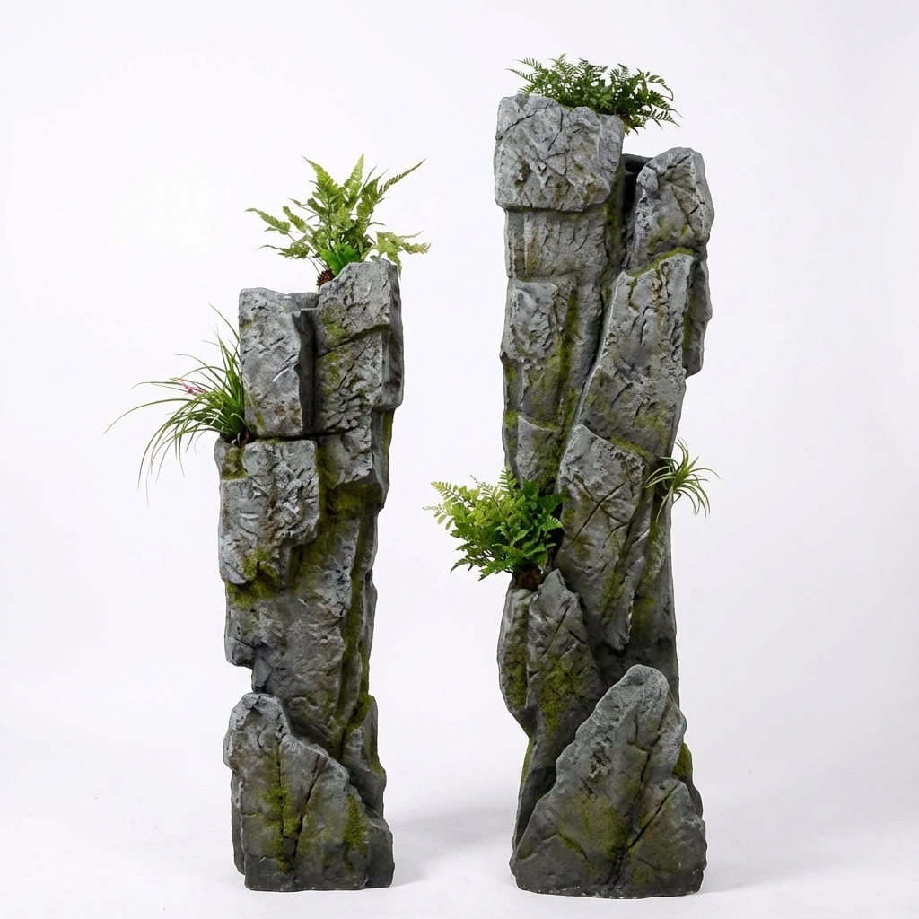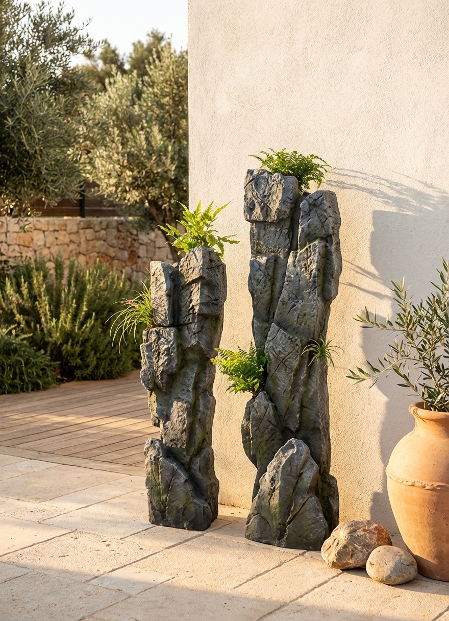 סט 2 עמודי אבן דקורטיביים, מושלמים להוספת מראה טבעי ומיוחד לגינה או למרפסת. עמודים אלו משמשים כבסיס נהדר לצמחייה מטפסת או כאלמנט עיצובי בפני עצמו.