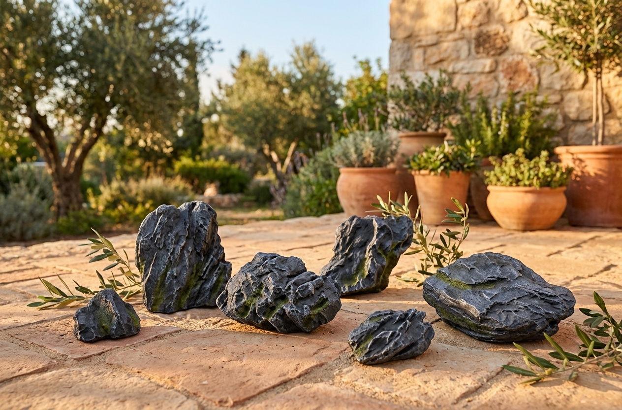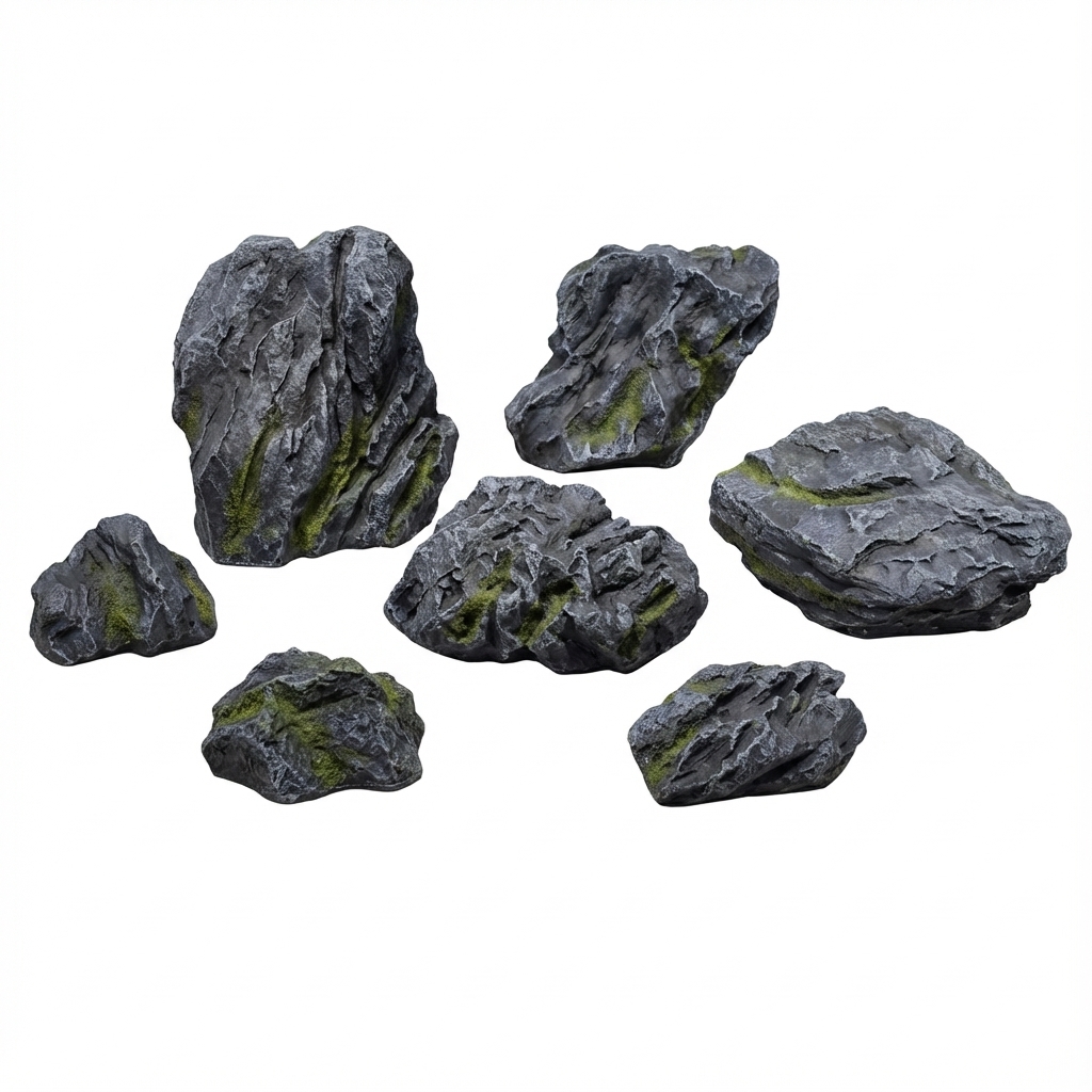 סט 6 סלעי נוי דקורטיביים בגדלים שונים, מושלם לעיצוב גינות נוי, בריכות נוי ואקווריומים. הסלעים עשויים מחומרים עמידים ואיכותיים, ומעניקים מראה טבעי ואותנטי לכל חלל.
