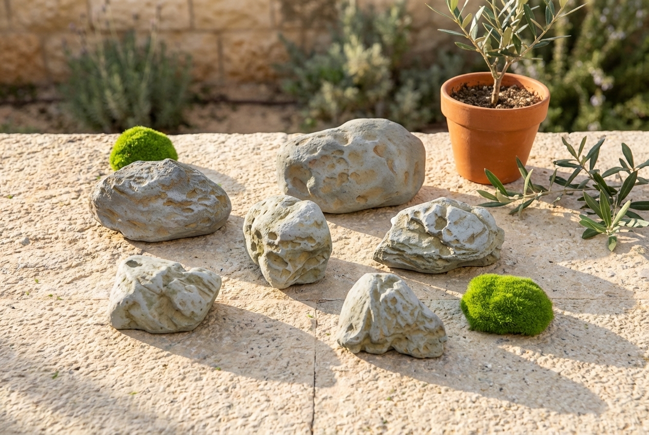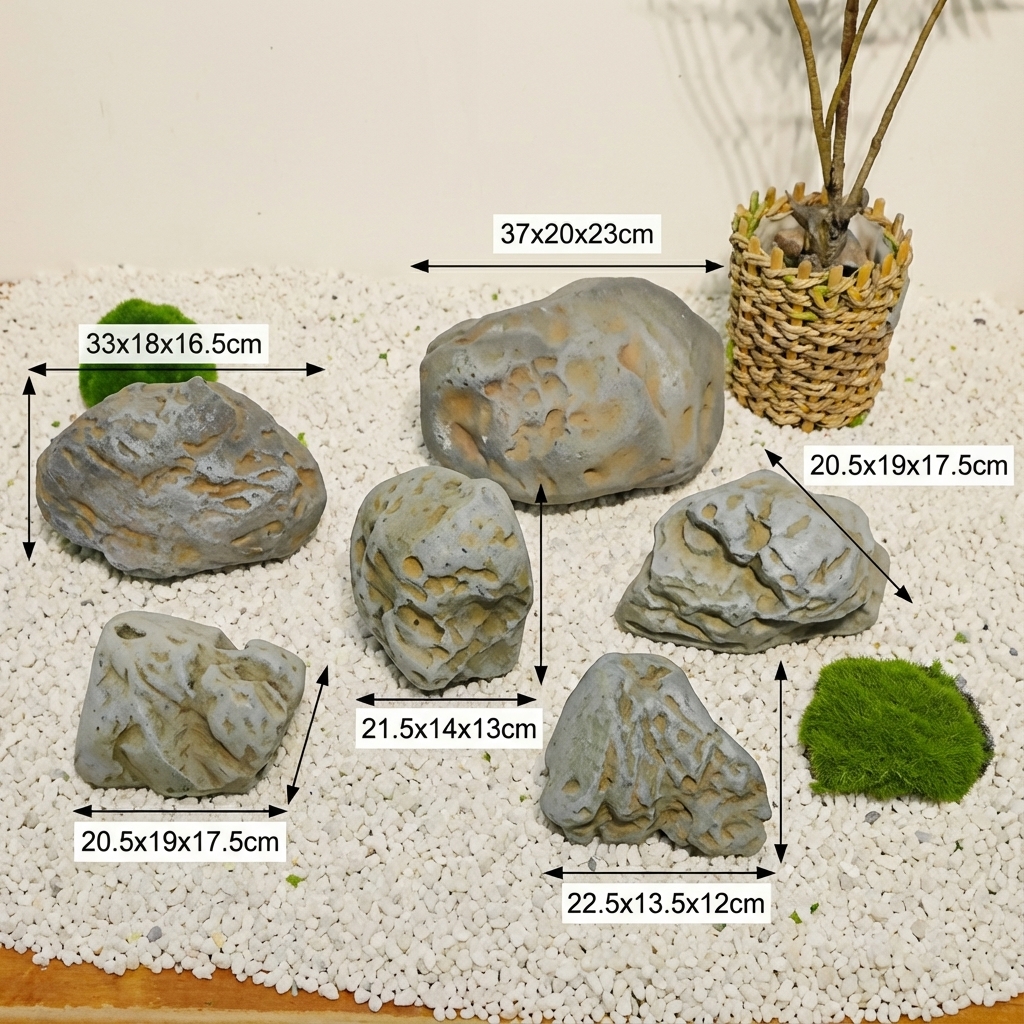 סט 7 סלעי נוי דקורטיביים בגווני אפור, המוסיפים מראה טבעי ומעוצב לכל חלל. מתאים במיוחד לעיצוב גנים, מרפסות, אקווריומים ופינות נוי.