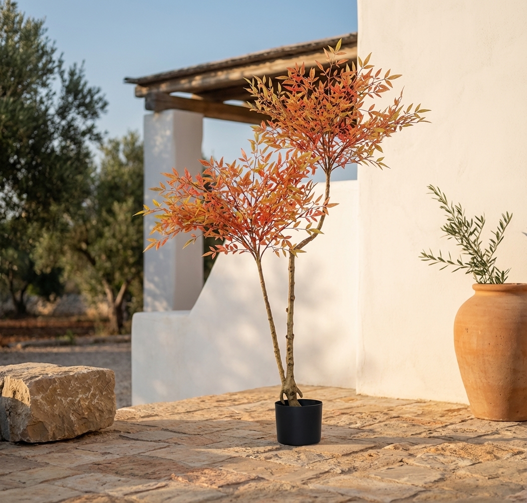 עץ ננדינה מלאכותי בעציץ, מושלם לעיצוב הבית או המשרד. העץ משרה אווירה רגועה ונעימה, ומתאים לכל חלל.