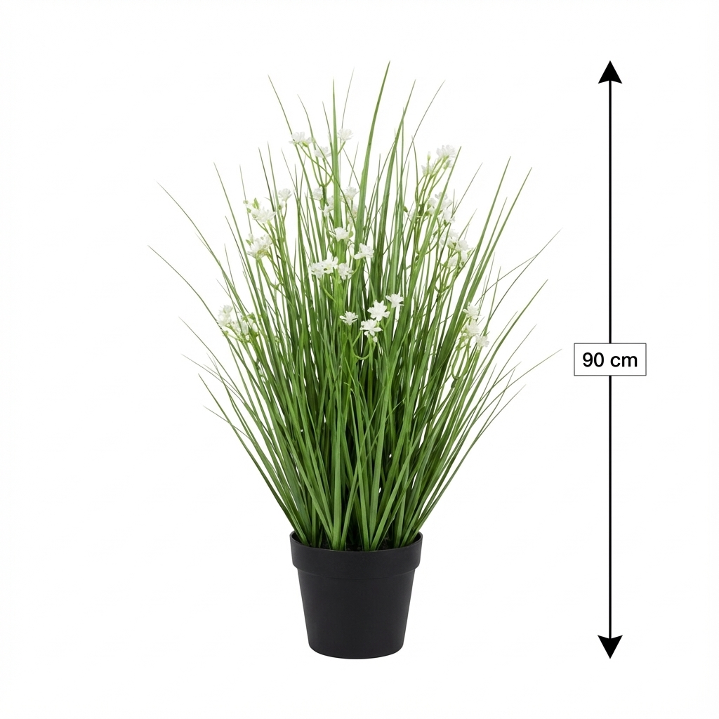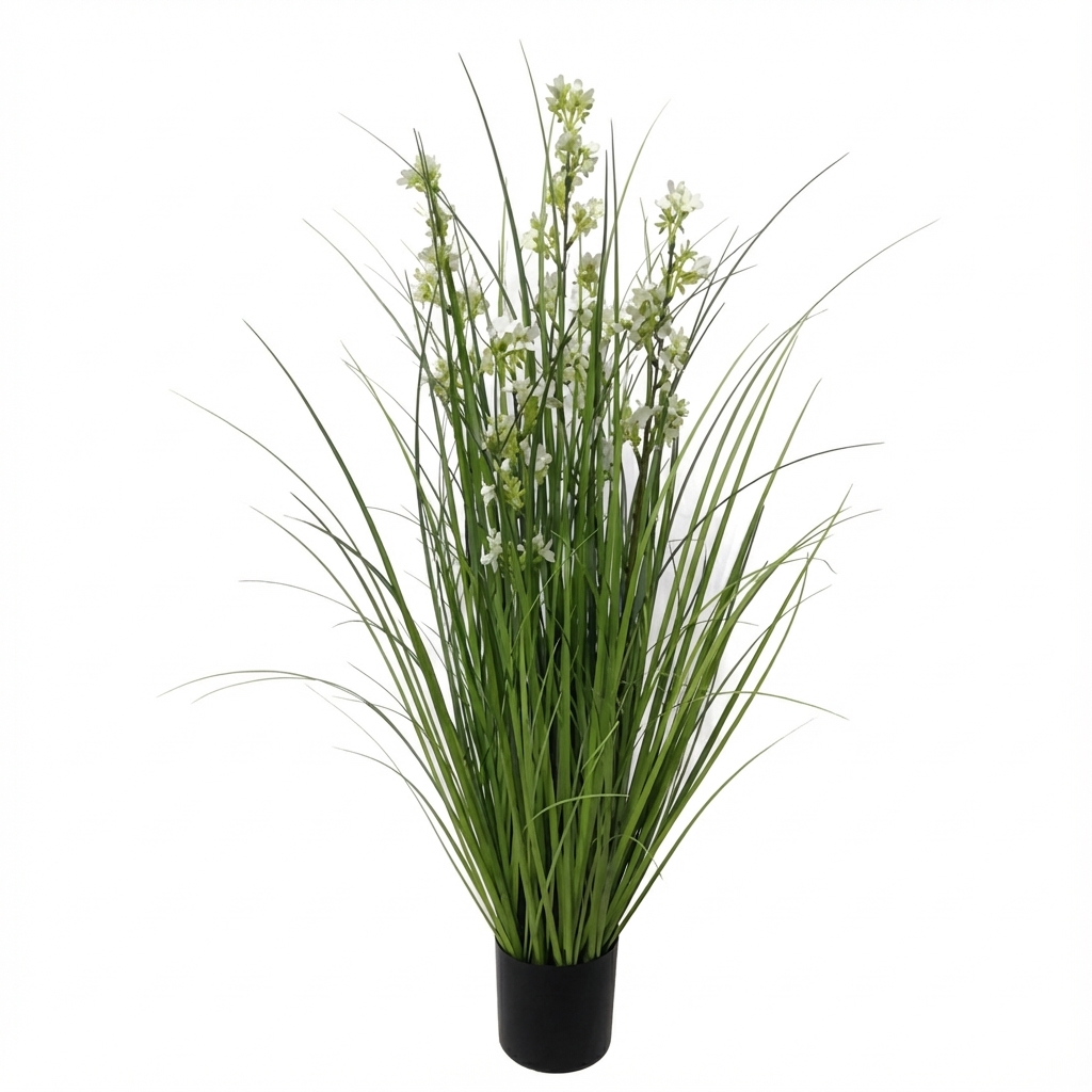 עציץ עשב מלאכותי עם 5 ראשים ופרחים לבנים קטנים, מתאים לעיצוב הבית, המשרד או הגינה. העציץ מוסיף מראה רענן וטבעי לכל חלל ומשרה אווירה נעימה.