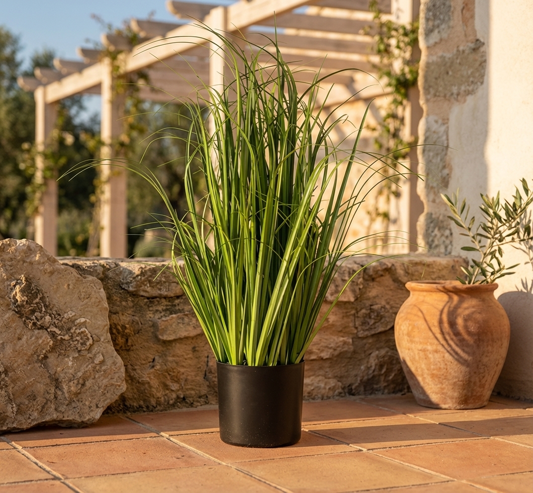עשב נוי מלאכותי בעציץ שחור, מושלם להוספת מגע של טבע ורעננות לחלל הפנימי. מתאים במיוחד למי שמחפש פתרון תחזוקה נמוכה לעיצוב הבית או המשרד.