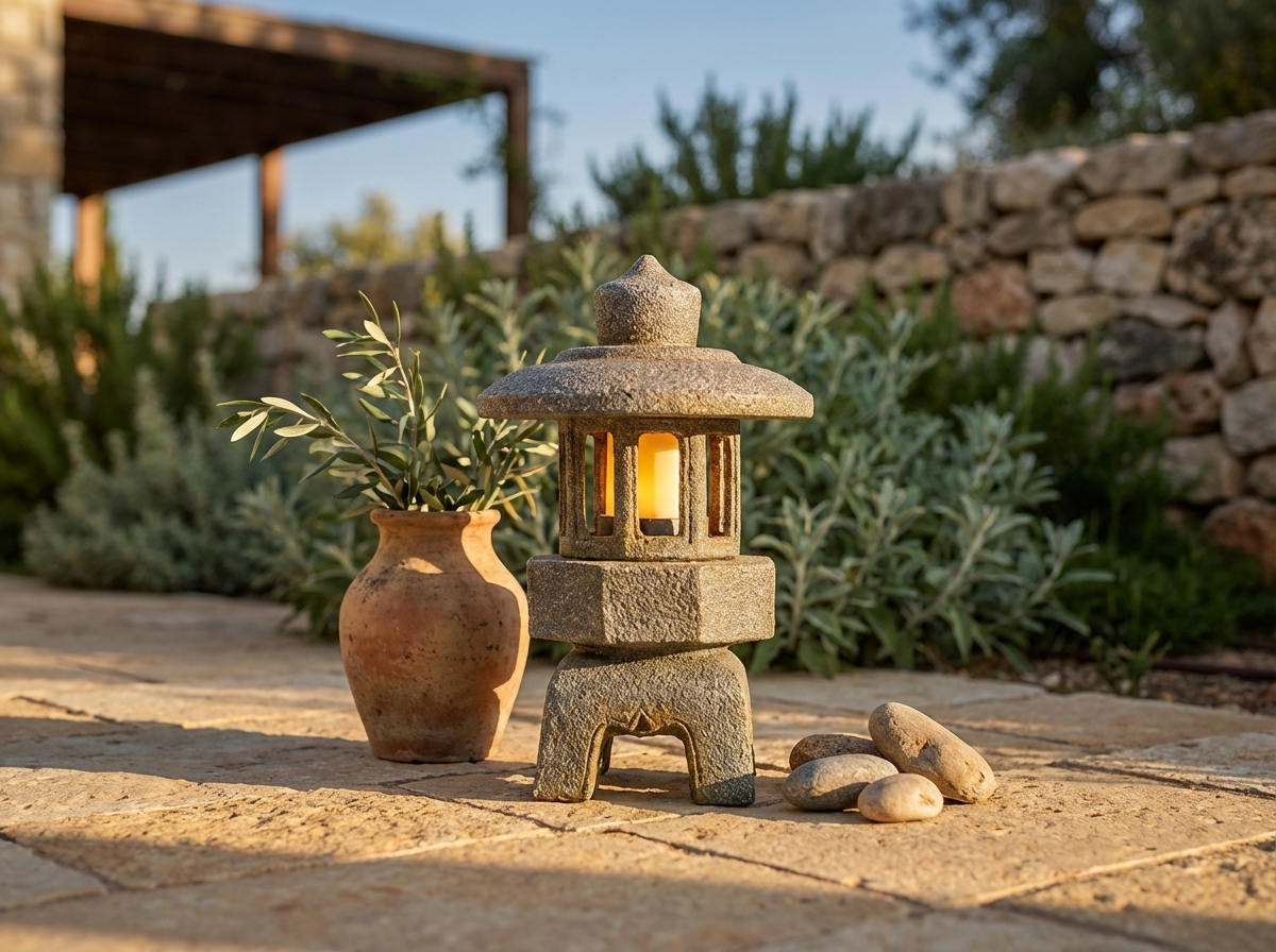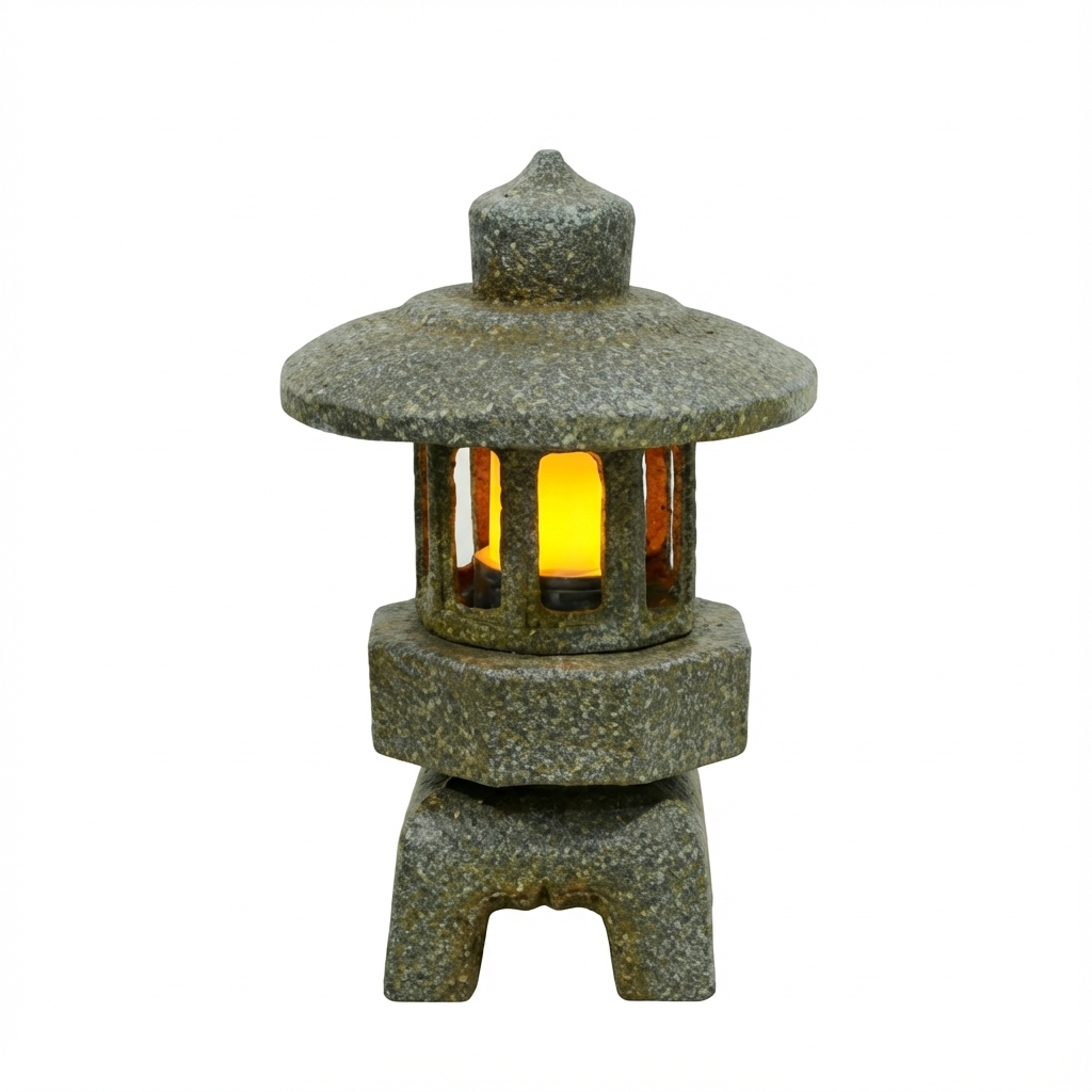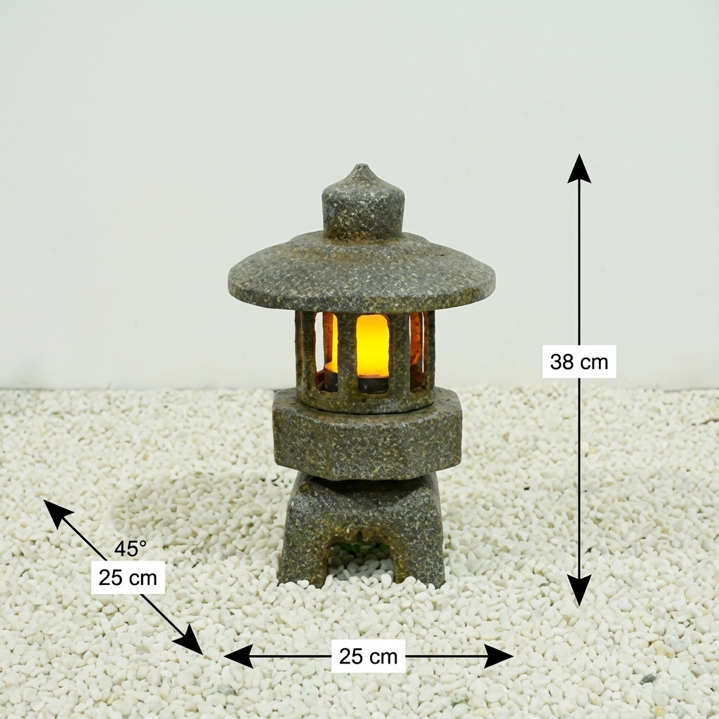 פנס ארמון עגול קטן דמוי אבן, המעניק אווירה יפנית מסורתית לגינה או למרפסת. פנס זה מתאים במיוחד לחובבי עיצוב יפני ולמי שמחפש תאורת אווירה עדינה.