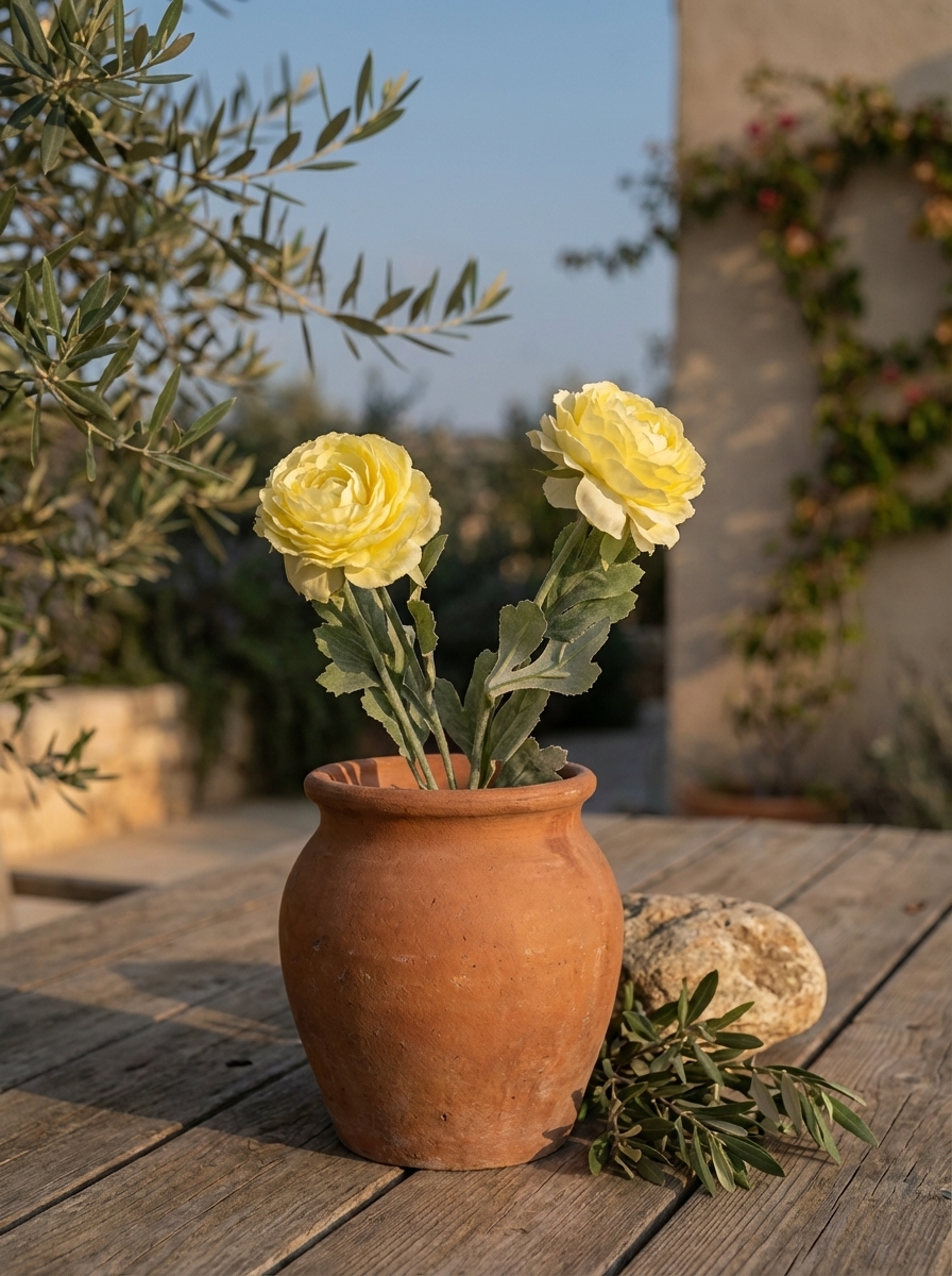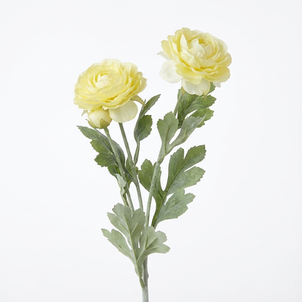 פרח ראנונקולוס מלאכותי, מושלם לעיצוב הבית או המשרד, בגוון צהוב עדין.
