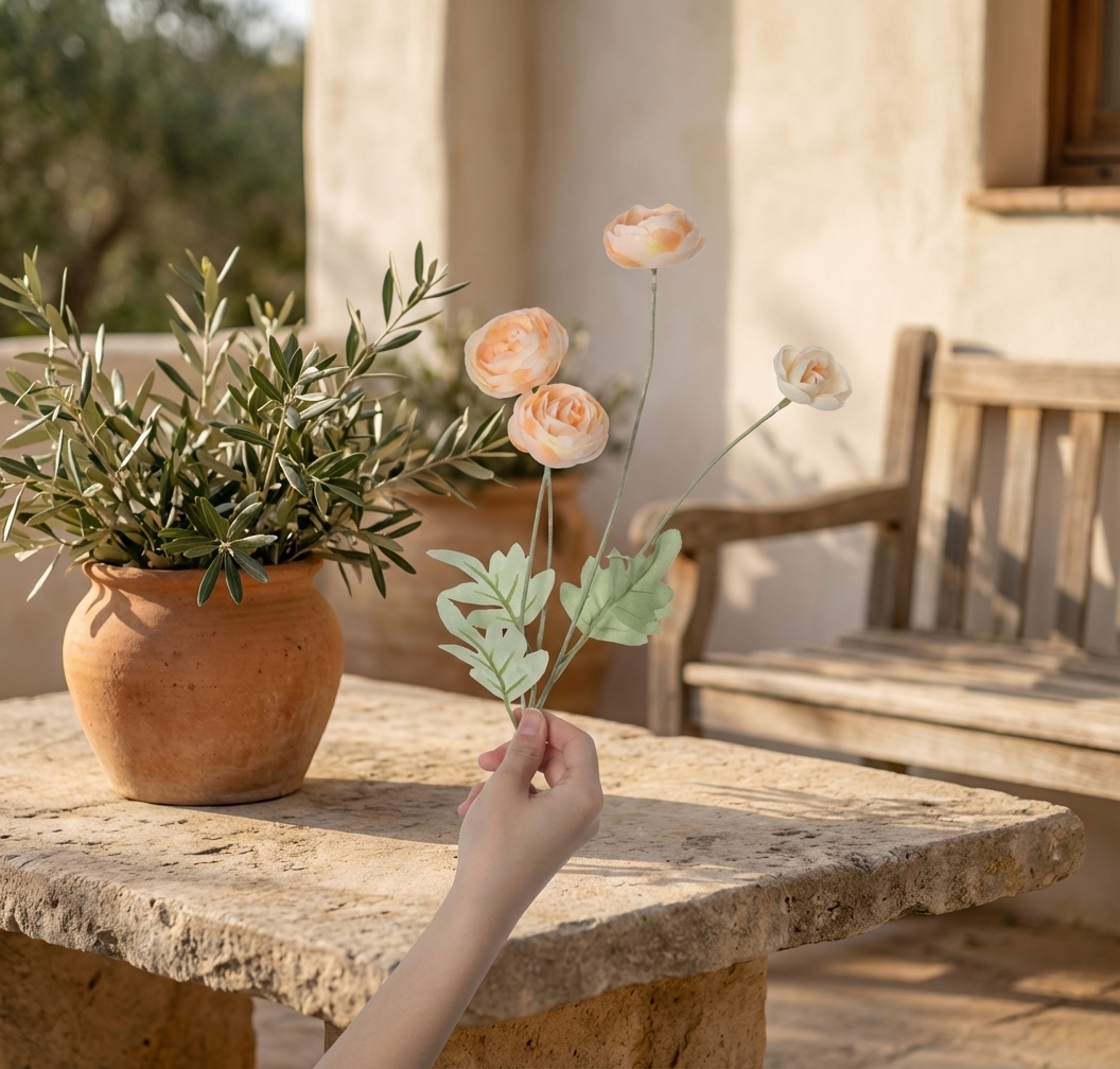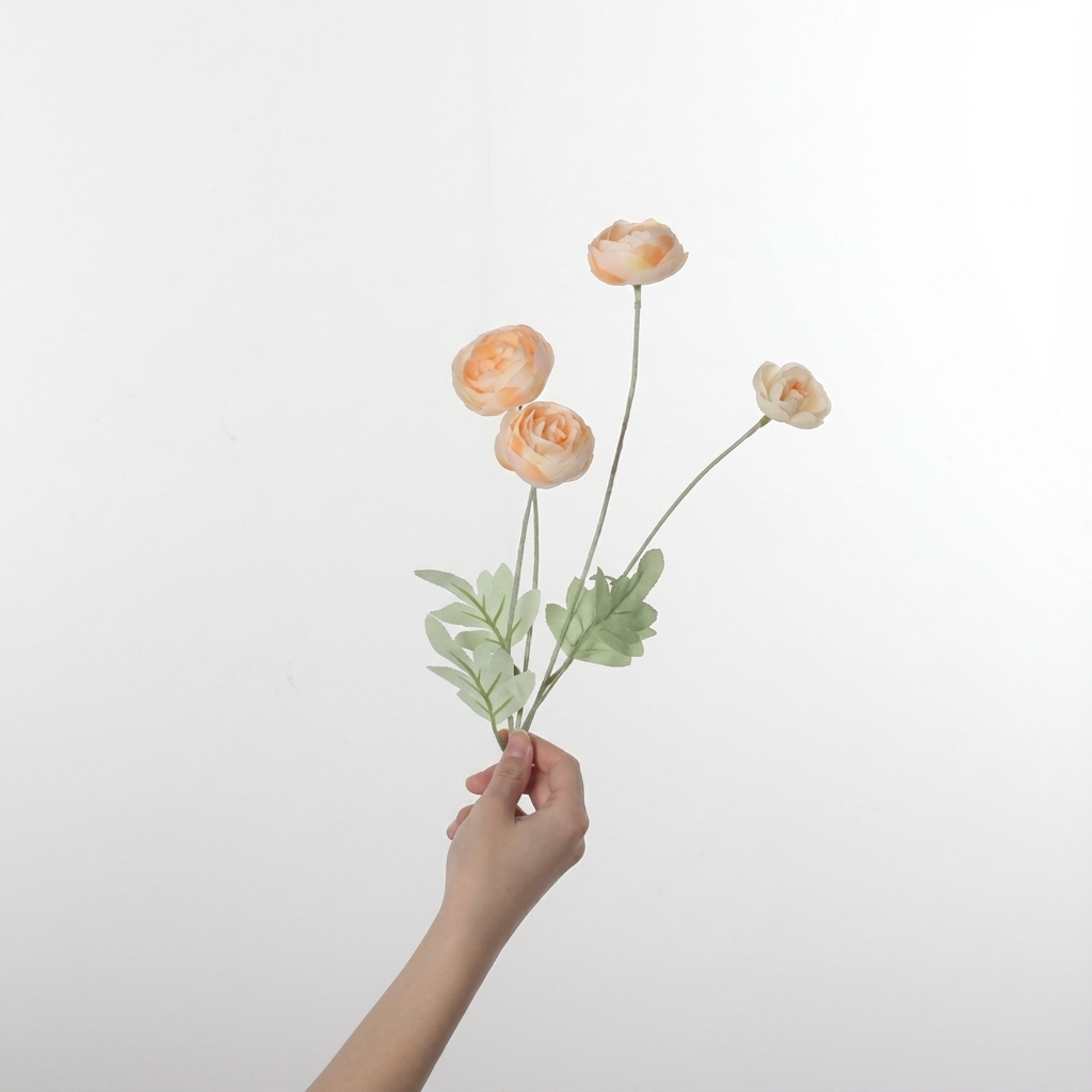 פרח רנunculus מלאכותי כתום, המעניק מראה רענן ואלגנטי לכל חלל. מתאים לשימוש כפריט עיצובי בודד או כחלק מסידור פרחים מרהיב.