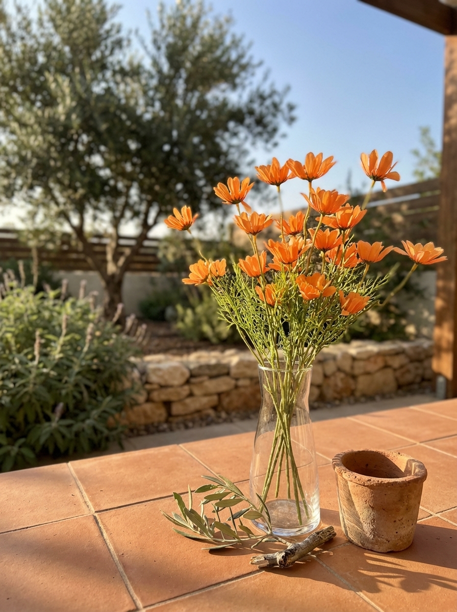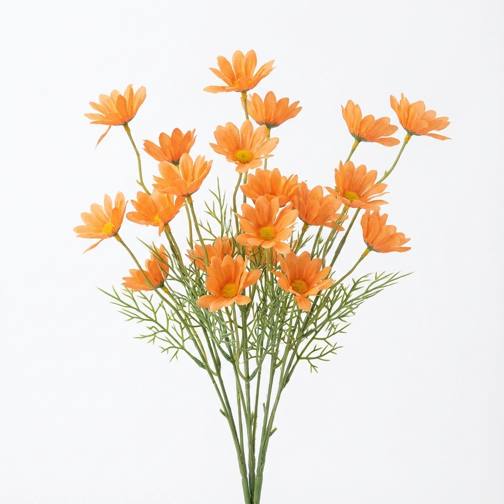 צרור פרחי קמומיל מלאכותיים בגוון כתום, מושלם להוספת מגע של צבע וחמימות לכל חלל. מתאים לקישוט הבית, המשרד או כחלק מסידורי פרחים לאירועים.