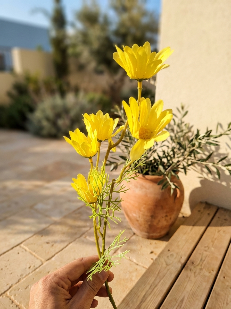צרור קמומיל מלאכותי, אידיאלי למי שמחפש להוסיף נגיעה של צבע ורעננות לחלל הבית או המשרד ללא צורך בתחזוקה. הפרחים הצהובים והעלים הירוקים יוצרים מראה טבעי ונעים.
