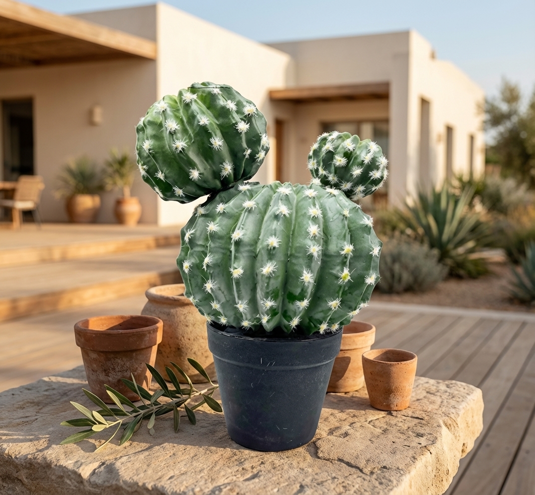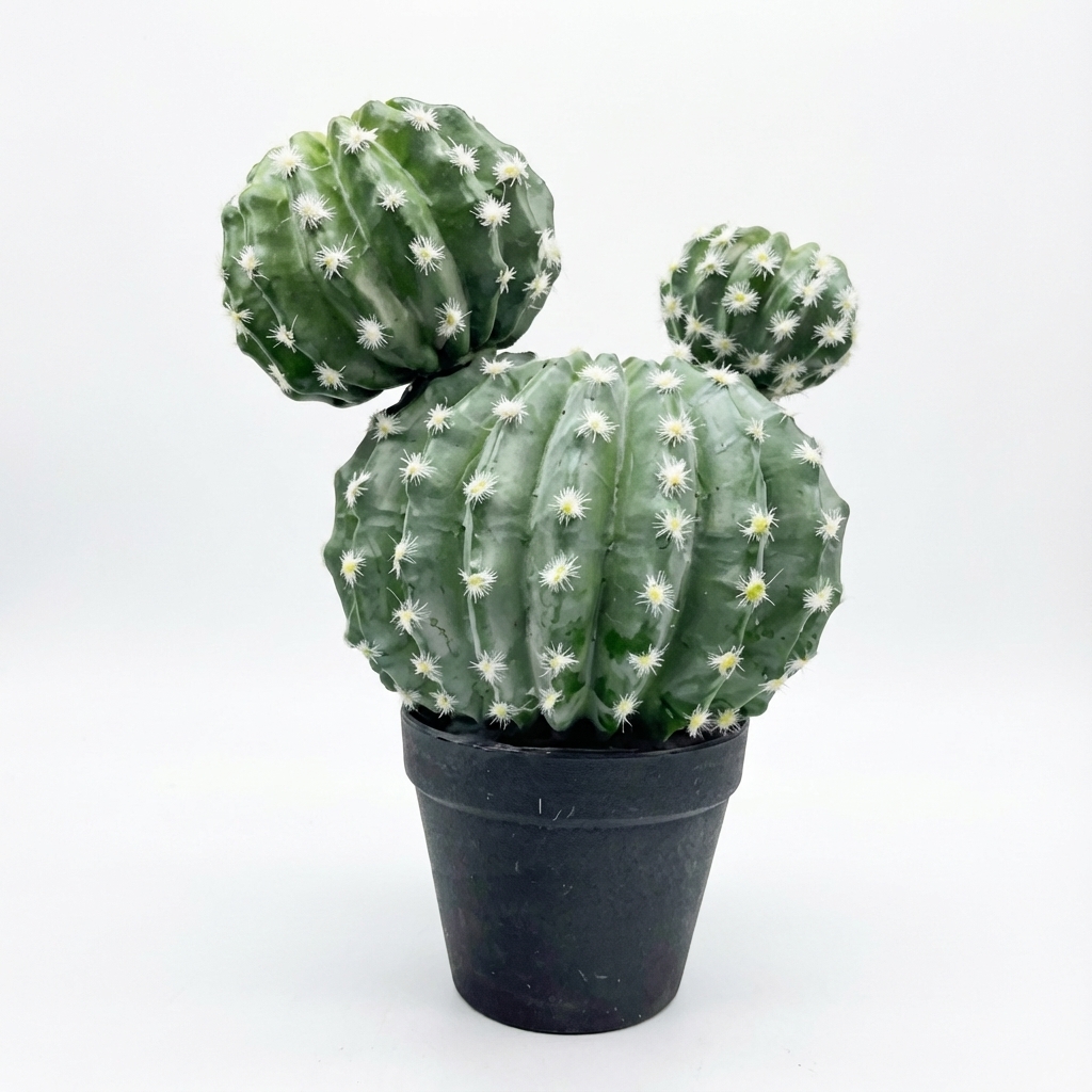 קקטוס מלאכותי כדור פרווה לבנה זוגי, אלמנט דקורטיבי מרהיב המדמה קקטוס כדורי בעל מראה ריאליסטי. מתאים לעיצוב הבית, המשרד או כמתנה מקורית לחובבי קקטוסים וצמחים.
